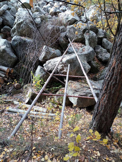 Зато когда уже спустился с отвала и шёл вокруг него, набрёл на чью-то подготовленную туристическую стоянку. Это явно заготовка для навеса, да и дрова сложены тоже не просто так: